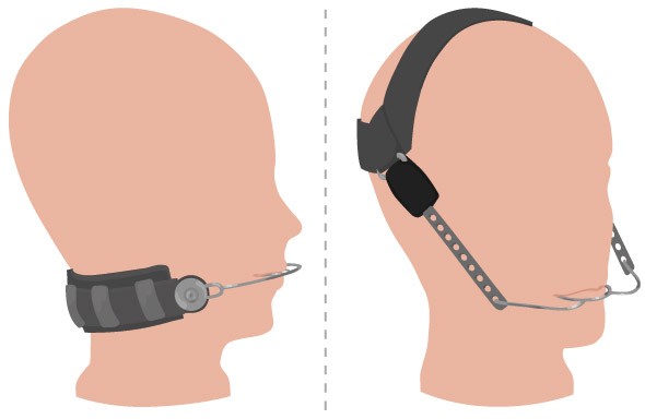 Der Headgear ist eine Außenspange, die herausnehmbar ist. Hierbei handelt es sich um einen Außenbogen, der mit Spezialbändern, die mit kleinen Röhrchen bestückt sind, an den Backenzähnen befestigt wird. Der Bogen wird in die Röhrchen gesteckt und mit einem elastischen Zug um den Nacken oder Kopf gespannt.